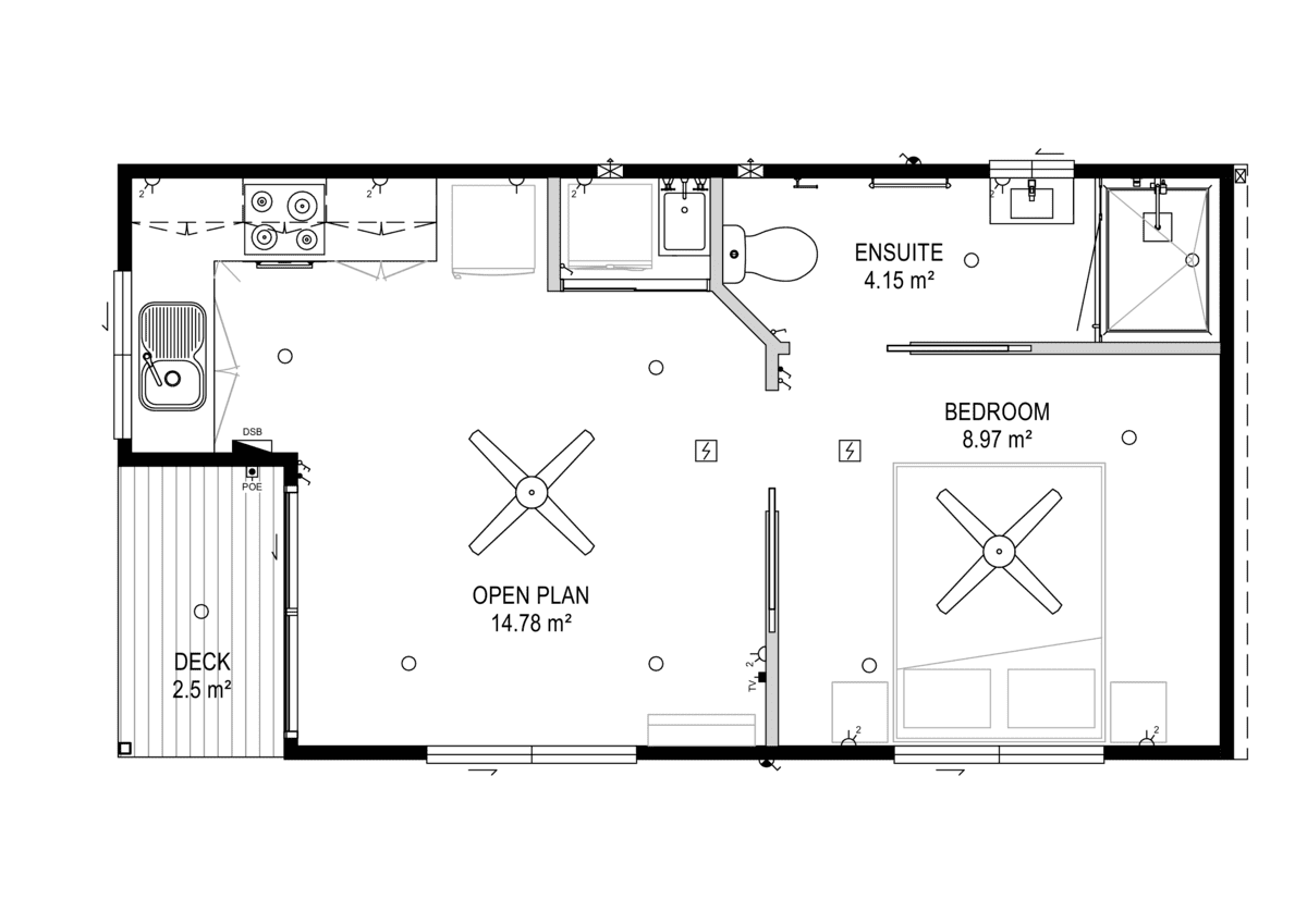 The Swagman is a cosy one bedroom house measuring in at 36sqm, complete with one bedroom, ensuite, kitchen and a comfortable living space. This building comes complete with all internal fit outs included and many upgrade options available, if desired. Let us fit out this stunning modern space to suit your style.