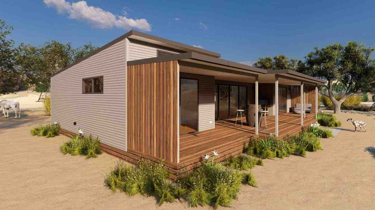 This space saver two bedroom is perfect for the tighter spaces or budgets. Keeping size and cost lower staying inside one larger module, we can still provide two good sizes bedrooms with built in robes, full bathroom, laundry cupboard and a combined kitchen/dining area.